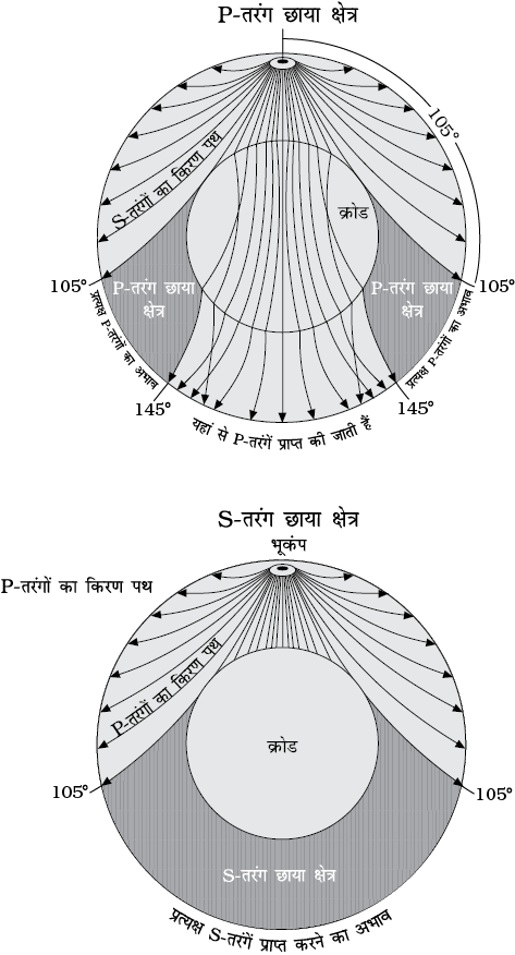 भूकंपलेखी यंत्र (Seismograph) पर दूरस्थ स्थानों से आने वाली भूकंपीय तरंगें अभिलेखित होती हैं। यद्यपि कुछ एेसे क्षेत्र भी हैं जहाँ कोई भी भूकंपीय तरंग अभिलेखित नहीं होती। एेसे क्षेत्र को भूकंपीय छाया क्षेत्र(Shadow zone) कहा जाता है। विभिन्न भूकंपीय घटनाओं के अध्ययन से पता चलता है कि एक भूकंप का छाया क्षेत्र दूसरे भूकंप के छाया क्षेत्र से सर्वथा भिन्न होता है। चित्र 3.2 अ और ब में ‘P’ व ‘S’ तरंगों का छाया क्षेत्र प्रदर्शित किया गया है। यह देखा जाता है कि भूकंपलेखी भूकंप अधिकेंद्र से 105° के भीतर किसी भी दूरी पर ‘P’ व ‘S’ दोनों ही तरंगों का अभिलेखन करते हैं। भूकंपलेखी, अधिकेंद्र से 145° से परे केवल ‘P’ तरंगों के पहुँचने को ही दर्ज करते हैं और ‘S’ तरंगों को अभिलेखित नहीं करते। अतः वैज्ञानिकों कामानना है कि भूकंप अधिकेंद्र से 105° और 145° के बीच का क्षेत्र (जहाँ कोई भी भूकंपीय तरंग अभिलेखित नहीं होती) दोनों प्रकार की तरगों के लिए छाया क्षेत्र (Shadow zone) हैं। 105° के परे पूरे क्षेत्र में ‘S’ तरंगें नहीं पहुँचतीं। ‘S’ तरंगों का छाया क्षेत्र ‘P’ तरंगों के छाया क्षेत्र से अधिक विस्तृत है। भूकंप अधिकेंद्र के 105° से 145° तक ‘P’ तरंगों का छाया क्षेत्र एक पट्टी (Band) के रूप में पृथ्वी के चारों तरफ प्रतीत होता है।‘S’ तरंगों का छाया क्षेत्र न केवल विस्तार में बड़ ा है, वरन् यह पृथ्वी के 40 प्रतिशत भाग से भी अधिक है। अगर आपको भूकंप अधिकेंद्र का पता हो तो आप किसी भी भूकंप का छाया क्षेत्र रेखांकित कर सकतेहैं। (किसी भूकंप अधिकेंद्र को जानने का विवरण बॉक्स में पृष्ठ 28 में दिया गया है।)