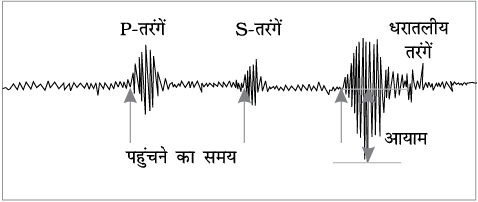 सभी प्राकृतिक भूकंप स्थलमंडल (Lithosphere) में ही आते हैं। इसी अध्याय में आगे आप पृथ्वी की विभिन्न परतों के बारे में पढ़ेंगे। अभी इतना समझ लेना पर्याप्त है कि स्थलमंडल पृथ्वी के धरातल से 200 कि0मी0 तक की गहराई वाले भाग को कहते हैं। भूकंपमापी यंत्र (Seismograph) सतह पर पहुँचने वालीभूकंपतरंगों को अभिलेखित करता हैं। चित्र 3.1 भूकंपीय तंरगों का अभिलेखीय वक्र (Curve) दिखाता है। यह वक्र तीन अलग बनावट वाली तरंगों को प्रदर्शित करता है। बुनियादी तौर पर भूकंपीय तरंगें दो प्रकार की हैं – भूगर्भिक तरंगें (Body waves) व धरातलीय तरंगें (Surface waves)। भूगर्भिक तरंगें उद्गम केंद्र से ऊर्जा के मुक्त होने के दौरान पैदा होती हैं और पृथ्वी के अंदरूनी भाग से होकर सभी दिशाओं में आगे बढ़ती हैं। इसलिए इन्हें भूगर्भिक तरंगें कहा जाता है। भूगर्भिक तरंगों एवं धरातलीय शैलों के मध्य अन्योन्य क्रिया के कारण नई तरंगें उत्पन्न होती हैं जिन्हें धरातलीय तरंगें कहा जाता है। ये तरंगें