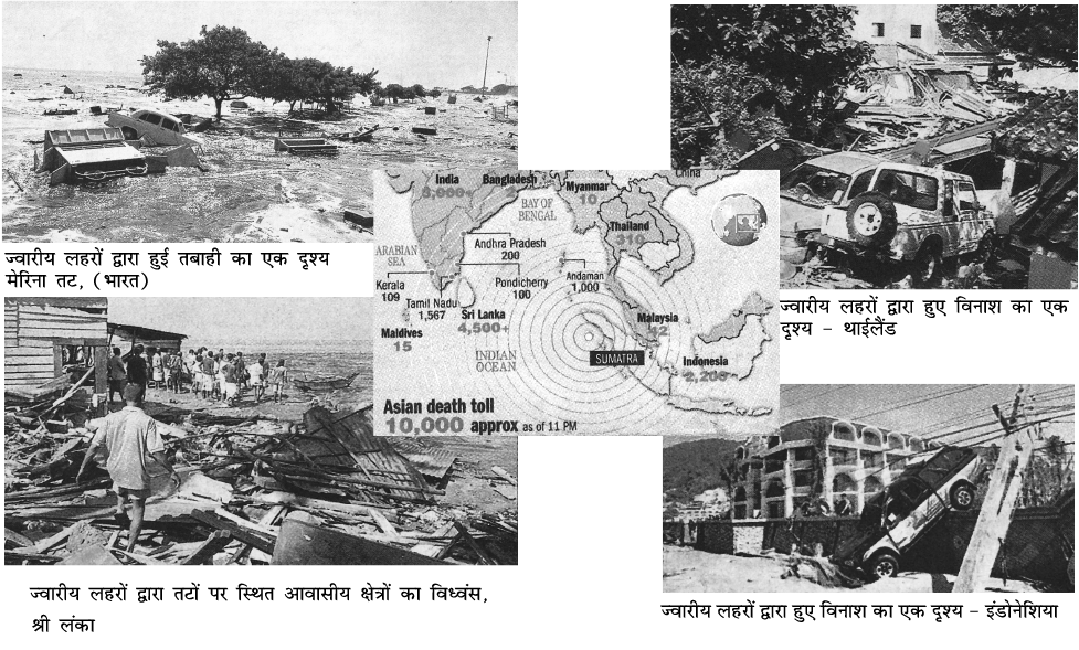 उपरोक्त सूचीबद्ध प्रभावों में से पहले छः का प्रभाव स्थलरूपों पर देखा जा सकता है जबकि अन्य को उस क्षेत्र में होने वाले जन व धन की हानि से समझा जा सकता है। ‘सुनामी’ का प्रभाव तभी पड़ ेगा जब भूकंप का अधिकेंद्र समुद्री अधस्तल पर हो और भूकंप की तीव्रता बहुत अधिक हो। ‘सुनामी’ अपने आप में भूकंप नहीं है, ये वास्तव में लहरें हैं जो भूकंपीय तरंगों से उत्पन्न होती हैं। यद्यपि मूल रूप से कंपन की क्रिया कुछ सेकेंड ही रहती है, फिर भी यदि भूकंप की तीव्रता रिक्टर स्केल पर 5 से अधिक है तो इसके परिणाम अत्यधिक विनाशकारी होते हैं।