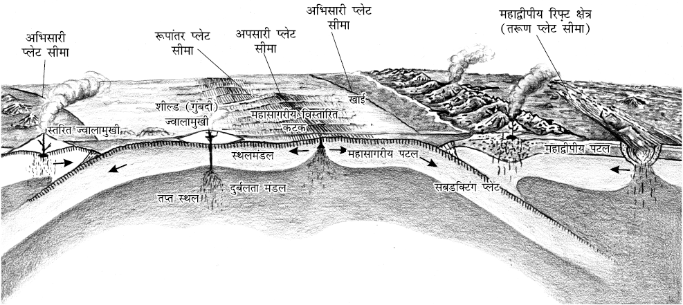 (i) यह देखा गया कि मध्य महासागरीय कटकों के साथ-साथ ज्वालामुखी उद्गार सामान्य क्रिया है और ये उद्गार इस क्षेत्र में बड़ ी मात्रा में लावा बाहर निकालते हैं।