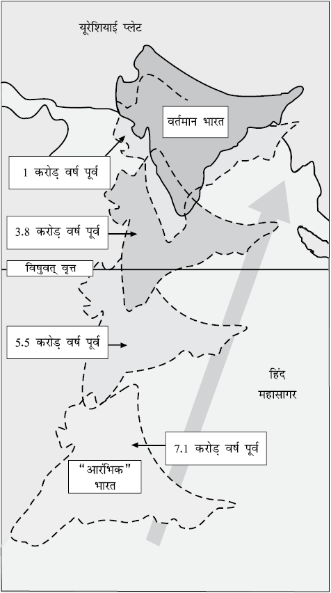 भारत एक वृहत् द्वीप था, जो आस्ट्रेलियाई तट से दूर एक विशाल महासागर में स्थित था। लगभग 22.5 करोड़ वर्ष पहले तक टेथीस सागर इसे एशिया महाद्वीप से अलग करता था। एेसा माना जाता है किलगभग 20 करोड़ वर्ष पहले, जब पैंजिया विभक्त हुआ तब भारत ने उत्तर दिशा की ओर खिसकना आरंभकिया। लगभग 4 से 5 करोड़ वर्ष पहले भारत एशिया से टकराया व परिणामस्वरूप हिमालय पर्वत काउत्थान हुआ। 7.1 करोड़ वर्ष पहले से आज तक की भारत की स्थिति मानचित्र 4.6 में दिखाई गई है।आरेख 4.6 भारतीय उपमहाद्वीप व यूरेशियन प्लेट की स्थिति भी दर्शाता है। आज से लगभग 14 करोड़ वर्ष पहले यह उपमहाद्वीप सुदूर दक्षिण में 50 0 दक्षिणी अक्षांश पर स्थित था। इन दो प्रमुख प्लेटों को टेथिस सागर अलग करता था और तिब्बतीय खंड, एशियाई स्थलखंड के करीब था। भारतीय प्लेट केयूरेशियन प्लेट की तरफ प्रवाह के दौरान एक प्रमुख घटना घटी-वह थी लावा प्रवाह से दक्कन ट्रेप कानिर्माण होना। एेसा लगभग 6 करोड़ वर्ष पहले आरंभ हुआ और एक लंबे समय तक यह जारी रहा। याद रहेकि यह उपमहाद्वीप तब भी भूमध्यरेखा के निकट था। लगभग 4 करोड़ वर्ष पहले और इसके पश्चात्हिमालय की उत्पत्ति आरम्भ हुई। वैज्ञानिकों का मानना है कि यह प्रक्रिया अभी भी जारी है और हिमालय कीऊँचाई अब भी बढ़ रही है।