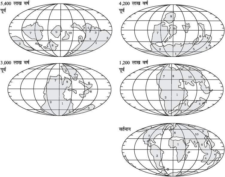 ग्लोब पर ये प्लेटें पृथ्वी के पूरे इतिहास काल में लगातार विचरण कर रही हैं। वेगनर की संकल्पना किकेवल महाद्वीप गतिमान हैं, सही नहीं है। महाद्वीप एक प्लेट का हिस्सा है और प्लेट चलायमान हैं। यहएक निर्विवाद तथ्य है कि भूवैज्ञानिक इतिहास में सभी प्लेट गतिमान रही हैं और भविष्य में भी गतिमान रहेंगी। चित्र 4.4 में विभिन्न कालों में महाद्वीपीय भागों की स्थिति को दर्शाया गया है। वेगनर के अनुसार आरंभ में, सभी महाद्वीपों से मिलकर बना एक सुपर महाद्वीप (Super continent) पैंजिया के रूप में विद्यमान था। यद्यपि बाद की खोजों ने यह स्पष्ट किया कि महाद्वीपीय पिंड, जो प्लेट के ऊपर स्थित हैं, भूवैज्ञानिक काल पर्यन्त चलायमान थे और पैंजिया अलग-अलग महाद्वीपीय खंडों के अभिसरण से बना था, जो कभी एक या किसी दूसरी प्लेट के हिस्से थे। पुराचुंबकीय (Palaeomagnetic) आँकड़ ों के आधार पर वैज्ञानिकों ने विभिन्न भूकालों में प्रत्येक महाद्वीपीय खंड की अवस्थिति निर्धारित की है। भारतीय उपमहाद्वीप (अधिकांशतः प्रायद्वीपीय भारत) की अवस्थिति नागपुर क्षेत्र में पाई जाने वाली चट्टानों के विश्लेषण के आधार पर आँकी गई है।