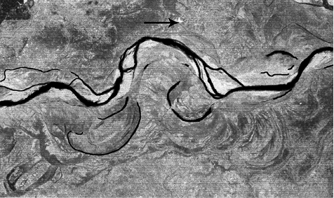 चित्र 7.7 मुज़फ्\फ़रपुर, बिहार के समीप विसर्पी बूढ़ी गंडक नदी दर्शाने वाला उपग्रह से लिया गया चित्र जिसमें कई छाड़ न झीलें दिखाई दे रही हैं।