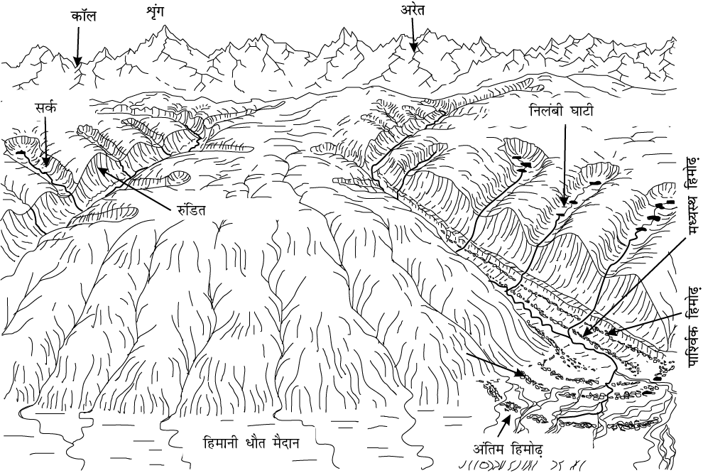 हिमनद के लगातार संचलित होने से हिमनद मलवा हटता होता है विभाजक नीचे हो जाता है और कालांतरमें ढाल इतने निम्न हो जाते हैं कि हिमनद की संचलन शत्तिη समाप्त हो जाती है तथा निम्न पहाड़ ियों व अन्यनिक्षेपित स्थलरूपों वाला एक हिमानी धौत (Outwash plain) रह जाता है। चित्र 7.12 तथा 7.13 हिमनद के अपरदन व निक्षेपण से निर्मित स्थलरूपों को दर्शाता है जिसका वर्णन भी अगले अनुच्छेदों में किया गया है।