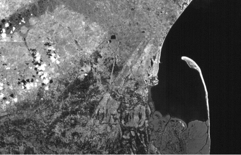 चित्र 7.5 ः कृष्णा नदी डेल्टा (आंध्र प्रदेश) के भाग का उपग्रह द्वारा लिया गया एक चित्र
