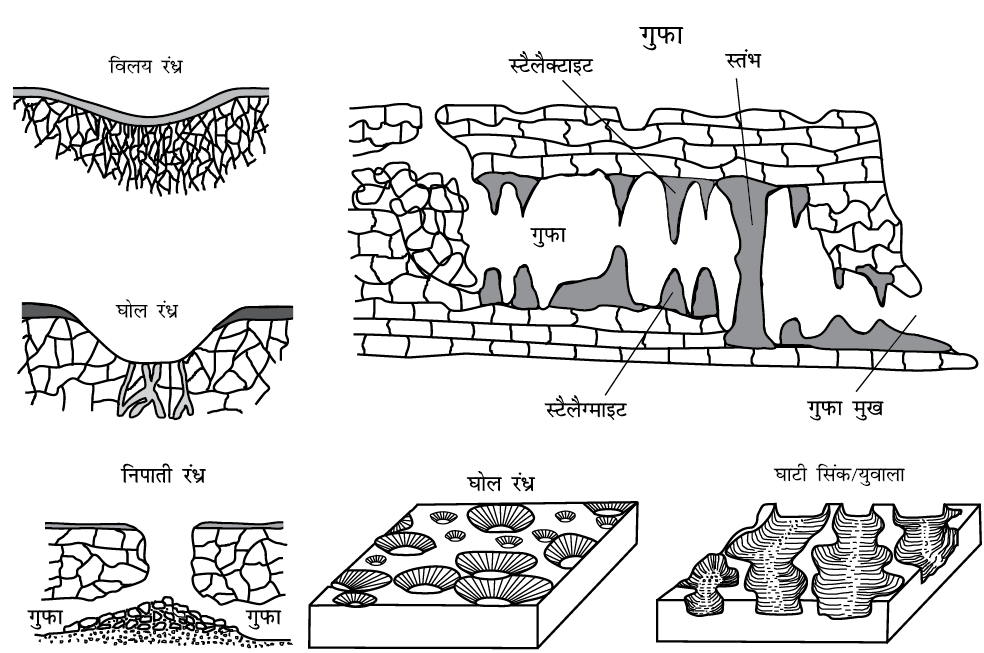 चित्र 7.9 कार्स्ट स्थलाकृति के विभिन्न रूपों का परिच्छेद चित्रण