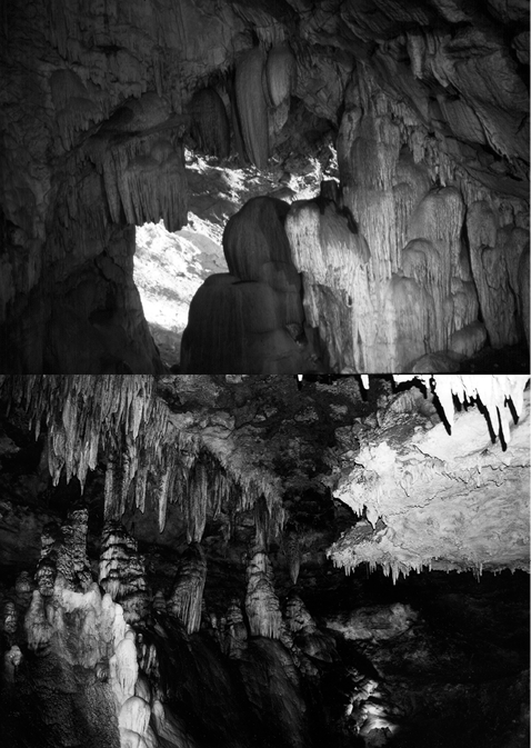 चित्र 7.10 चूना पत्थर गुफा में स्टैलैक्टाइट एवं स्टैलेग्माइट
