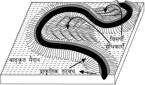 चित्र 7.6 प्राकृतिक तटबंध एवं विसर्पी रोधिकाओं का चित्रण