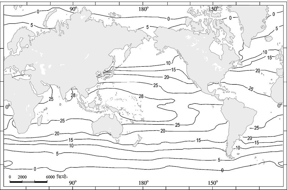 चित्र 13.4 : महासागरों की सतह के तापमान (से॰) का स्थानिक प्रतिरूप