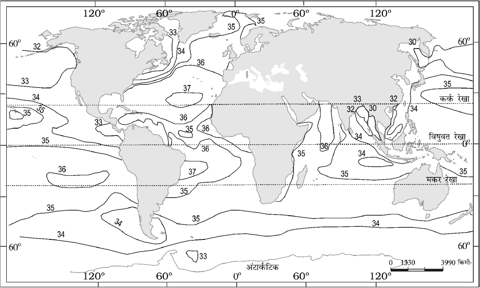 चित्र 13.5 : महासागरों में सतही लवणता का वितरण