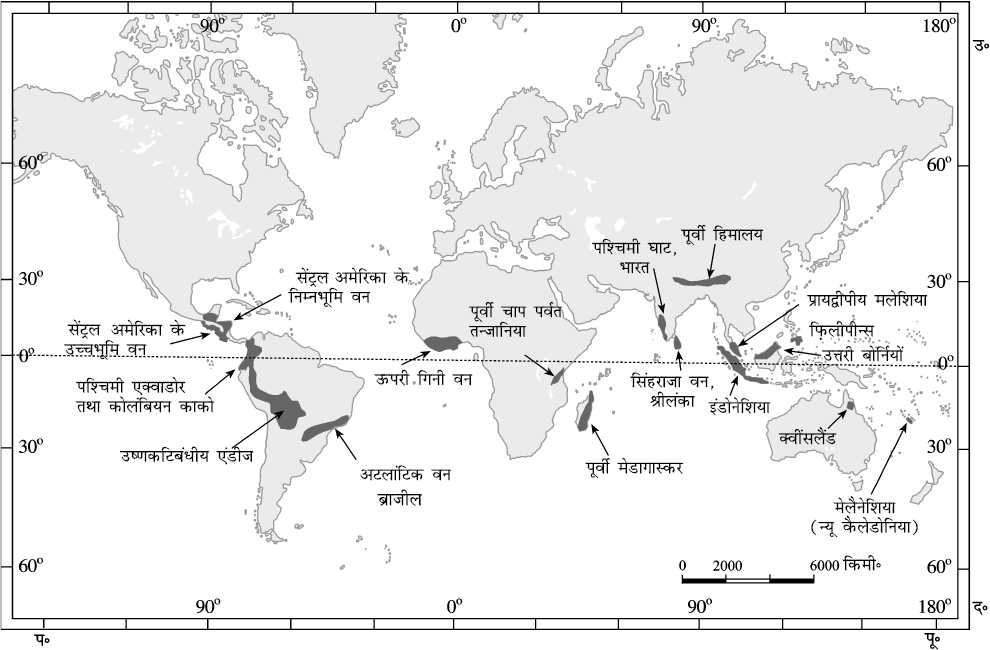 चित्र 16.1ः कुछ पारिस्थितिक हॉट-स्पॉट (Ecological 'hotspots' in the world)