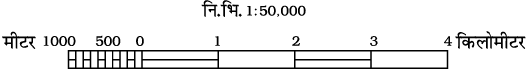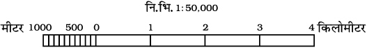 5. 1ः50,000 मापक पर एक आलेखी मापनी की रचना कीजिए जिसमें किलोमीटर एवं मीटर पढ़े जा सकें।
