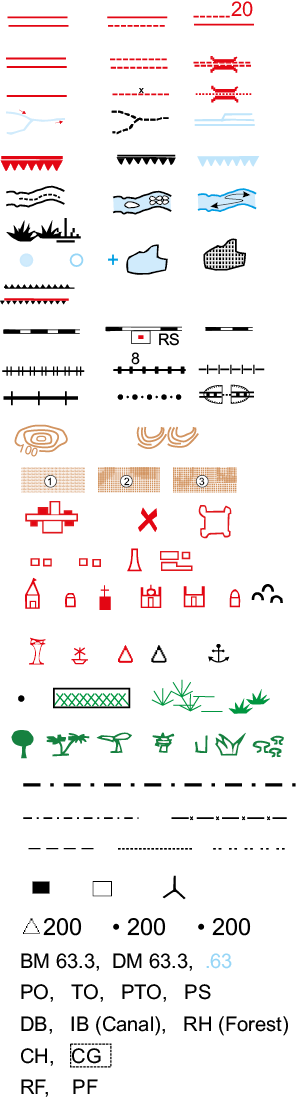 स्थलाकृतिक मानचित्र पठन: स्थलाकृतिक मानचित्रों का अध्ययन आसान होता है। इसके लिए पाठक को मानचित्रों पर दी गई निर्देशिका, रूढ़ चिह्न, प्रतीक एवं रंगों को जानना आवश्यक है। स्थलाकृतिक मानचित्रों पर दिए गए रूढ़ चिह्नों एवं संकेतों को चित्र 5.2 में दिखाया गया है।