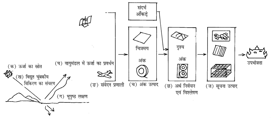 (छ) आँकड़ा उत्पाद से विषयानुरूप सूचना सामग्री को निकालना: धरातल पर स्थित आँकड़ा संग्रहण केंद्रों में संग्रहित बिंबों को प्राप्त करने के पश्चात् आँकड़े एकत्रीकरण के दौरान हुई त्रुटियों को दूर करने की कार्यवाही की जाती है। त्रुटियों को दूर करने के पश्चात् शुद्ध आंकिक आँकड़ों बिंब प्रकमण तकनीक की सहायता से तथा बिंब का चाक्षुष विधि में विश्लेषित की जाती है। व्याख्या के पश्चात् अलग-अलग विषय के अनुरूप सूचनाएें प्राप्त की जाती हैं।