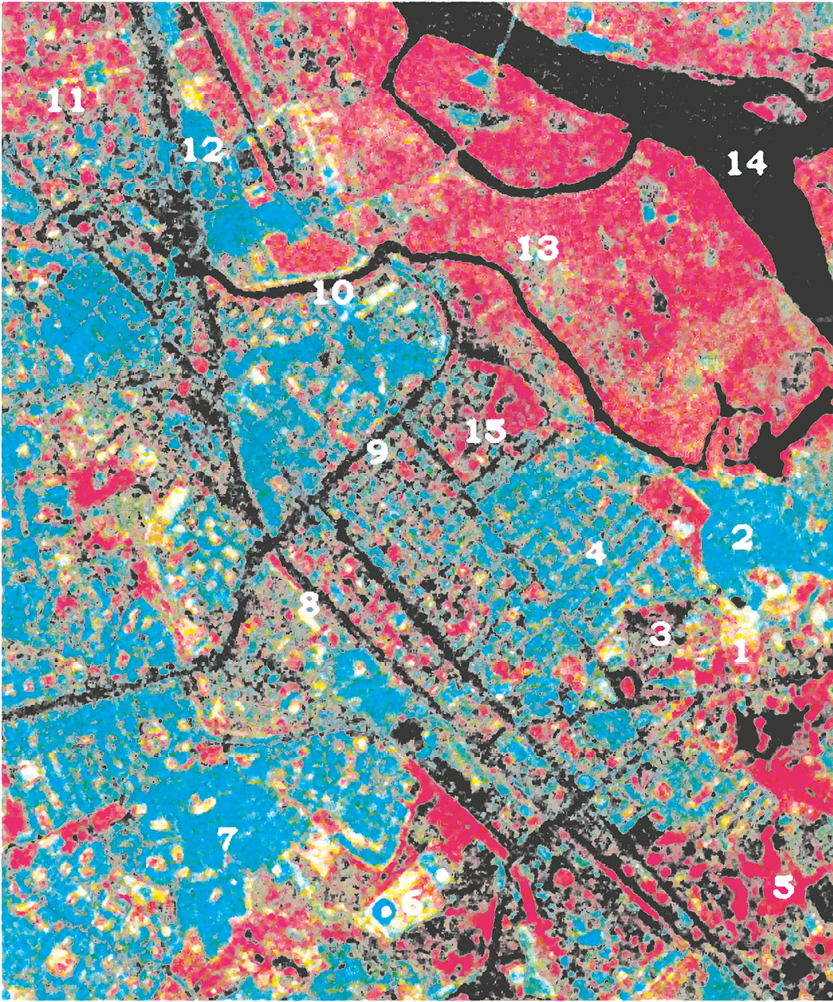 | 1. | स्वस्थ वनस्पति एवं कृष्ट क्षेत्र सदाबहार पर्णपाती कुंज शस्य भूमि परती भूमि | लाल से मैजेंटा भूरे से लाल लाल धब्बों सहित हल्का भूरा चमकीला लाल हल्के नीले से सफेद |