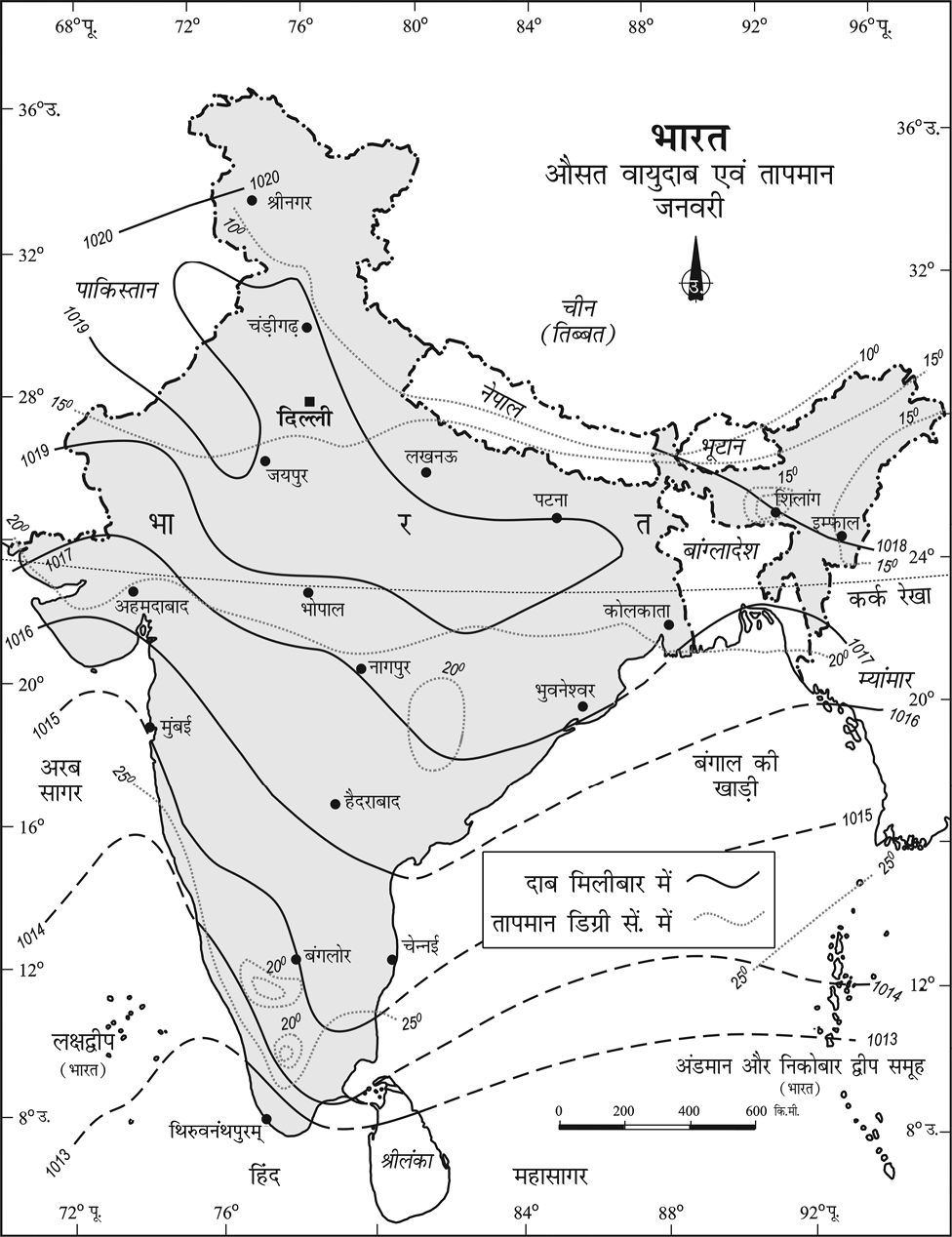चित्र 8.12 : भारत-जनवरी में औसत तापमान एवं दाब