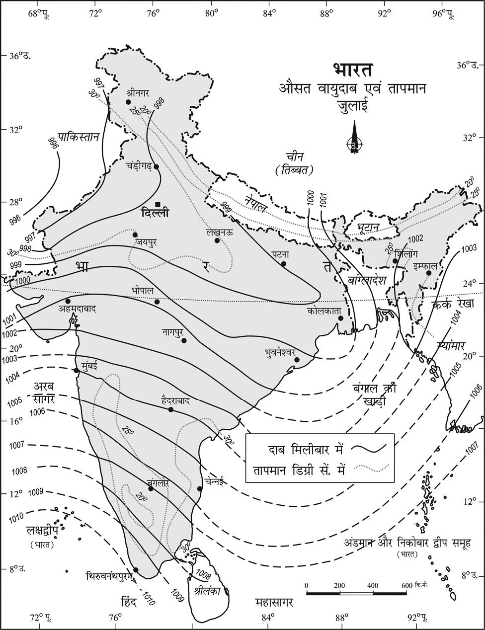 चित्र 8.13 : भारत-जुलाई में औसत वायुदाब एवं तापमान