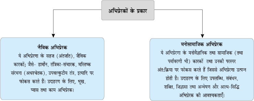 - अभिप्रेरणाएँ दो प्रकार की होती हैं - जैविक तथा मनोसामाजिक।