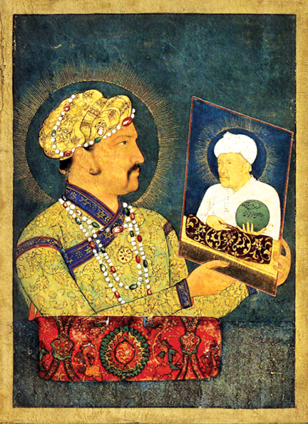 This painting by Abu’l Hasan shows Jahangir dressed in resplendent clothes and jewels, holding up a portrait of his father Akbar.