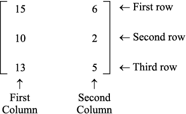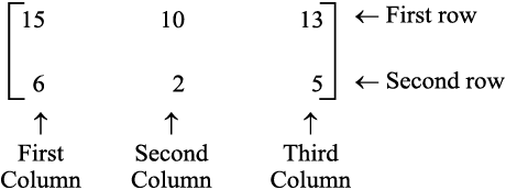 Suppose we wish to express the information that Radha has 15 notebooks. We may express it as [15] with the understanding that the number inside [ ] is the number of notebooks that Radha has. Now, if we have to express that Radha has 15 notebooks and 6 pens. We may express it as [15 6] with the understanding that first number inside [ ] is the number of notebooks while the other one is the number of pens possessed by Radha. Let us now suppose that we wish to express the information of possession of notebooks and pens by Radha and her two friends Fauzia and Simran which