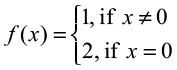 This function is also defined at every point. Left and the right hand limits at x = 0 are both equal to 1. But the value of the function at x = 0 equals 2 which does not coincide with the common value of the left and right hand limits. Again, we note that we cannot draw the graph of the function without lifting the pen. This is yet another instance of a function being not continuous at x = 0.