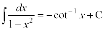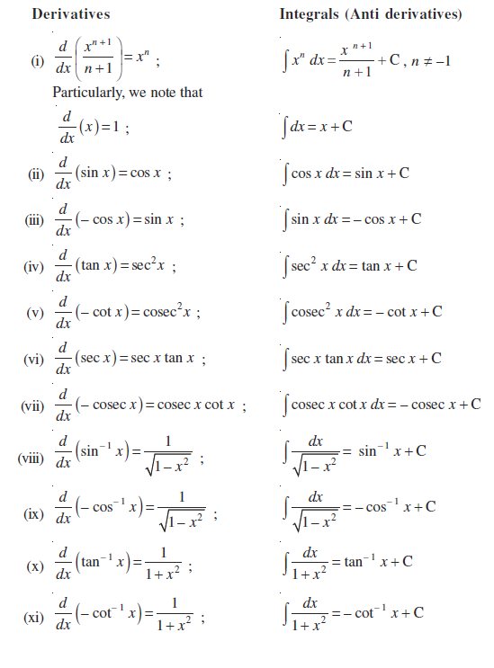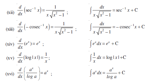 We already know the formulae for the derivatives of many important functions. From these formulae, we can write down immediately the corresponding formulae (referred to as standard formulae) for the integrals of these functions, as listed below which will be used to find integrals of other functions.