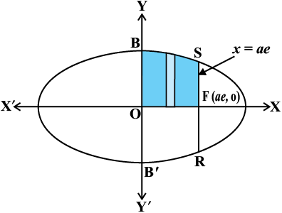 Solution The required area (Fig 8.12) of the region BOB′RFSB is enclosed by the ellipse and the lines x = 0 and x = ae.