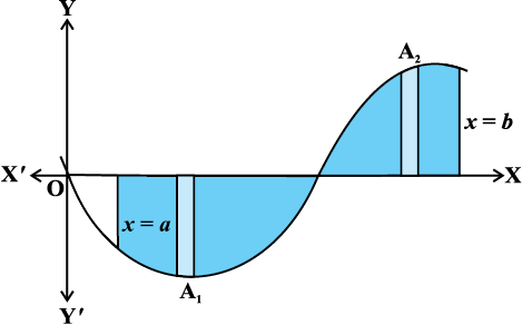 Generally, it may happen that some portion of the curve is above x-axis and some is below the x-axis as shown in the Fig 8.4. Here, A1 < 0 and A2 > 0. Therefore, the area A bounded by the curve y = f (x), x-axis and the ordinates x = a and x = b is given