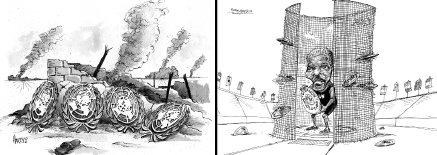 During June 2006, Israel attacked Lebanon, saying that it was necessary to control the militant group called Hezbollah. Large numbers of civilians were killed and many public buildings and even residential areas came under Israeli bombardment. The UN passed a resolution on this only in August and the Israel army withdrew from the region only in October. Both these cartoons comment on the role of the UN and its Secretary-General in this episode.