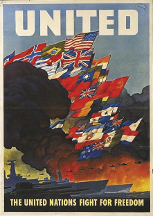 The US Office of War Information created the above poster during the Second World War as per the Declaration by United Nations of 1942. The poster features the flags of all nations that were part of the Allied Forces. It reflects the belligerent origins of the UN.
