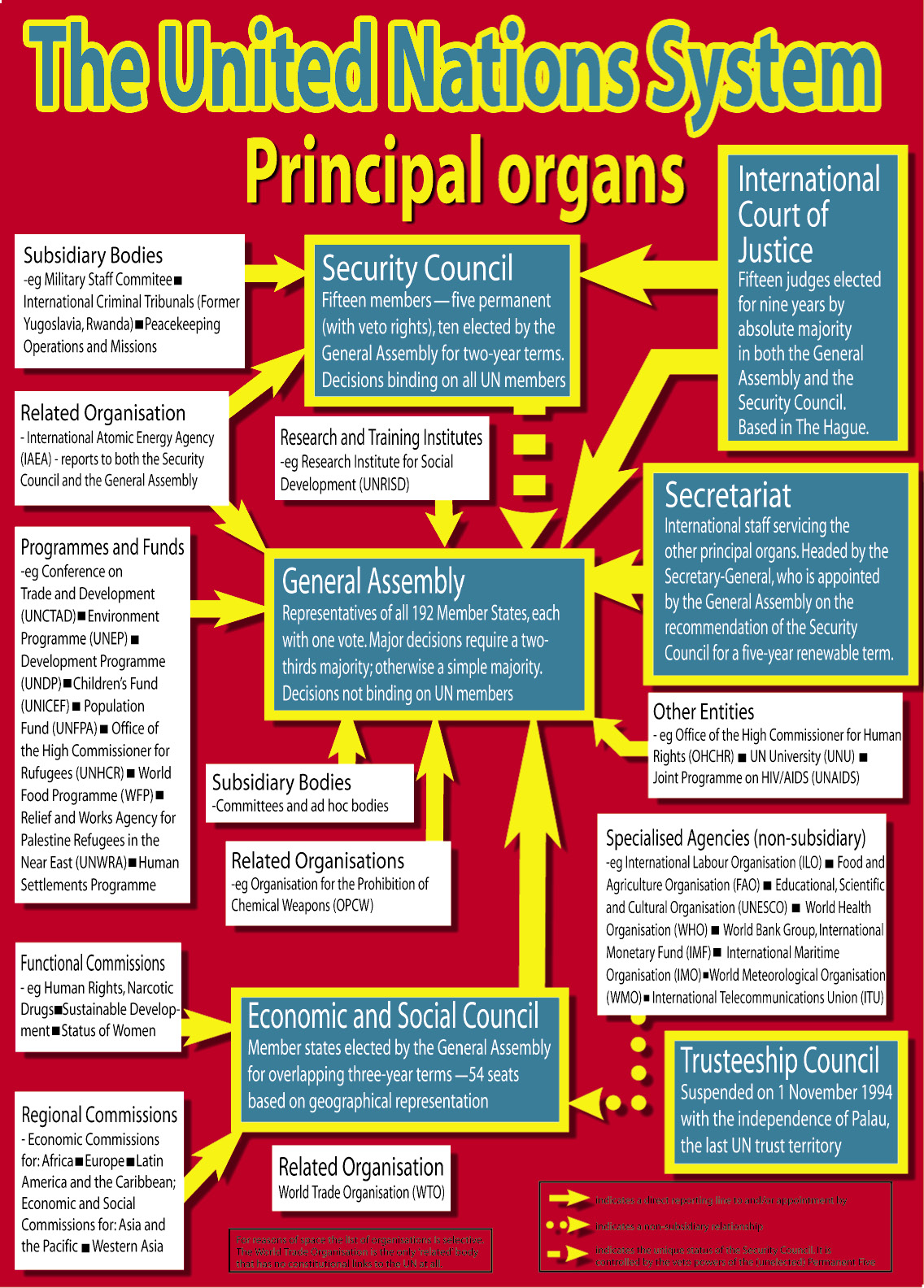 The UN consists of many different structures and agencies. War and peace and differences between member states are discussed in the General Assembly as well as the Security Council. Social and economic issues are dealt with by many agencies including the World Health Organisation (WHO), the United Nations Development Programme (UNDP), the United Nations Human Rights Commision (UNHRC), the United Nations High Commission for Refugees (UNHCR), the United Nations Children’s Fund (UNICEF), and the United Nations Educational, Scientific, and Cultural Organisation (UNESCO), among others