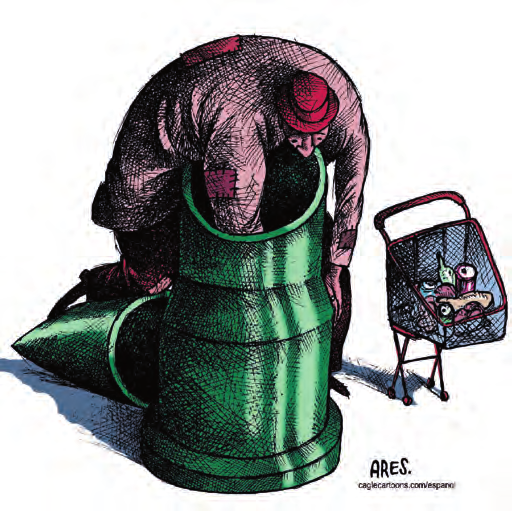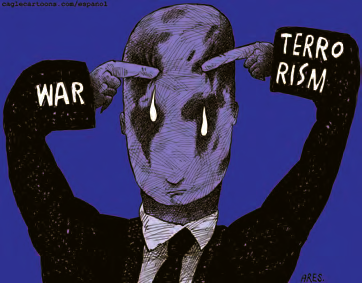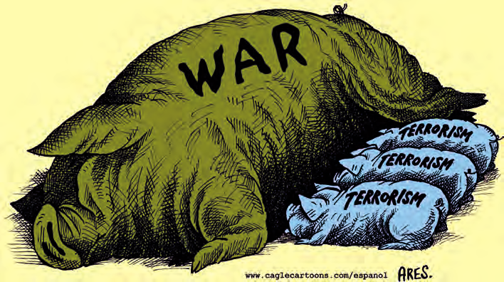 12. Read the cartoon below and write a short note in favour or against the connection between war and terrorism depicted in this cartoon