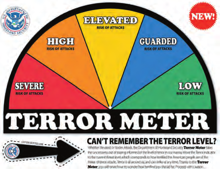 The text says: “Whether Elevated or Under Attack, the Department of Homeland Security Terror Meter takes the uncertainty out of staying informed of the level of terror in our nation. Move the Terror Indicator to the current threat level, which corresponds to how terrified the Americal people are of the threat of terror attacks. Terror is all around us, and can strike at anytime. Thanks to the Terror Meter, you will never have to wonder how terrified you should be. Proceed with caution”.