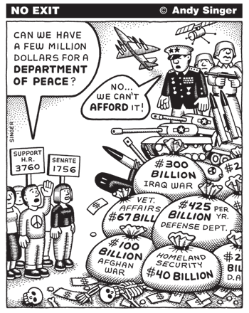 The cartoon comments on the massive expenditure on defence and lack of money for peace-related initiatives in the US. Is it any different in our country?