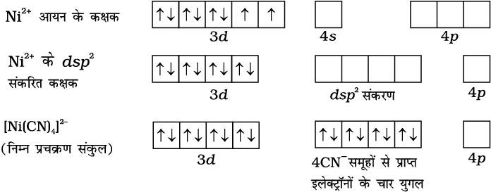 , में +2 है। CO लिगन्ड की उपस्थिति में, Ni के अयुगलित d इलेक्ट्रॉन युगलित हो जाते हैं परंतु Cl– एक दुर्बल लिगन्ड है। इसलिए अयुगलित इलेक्ट्रॉनों को युगलित नहीं कर पाता।