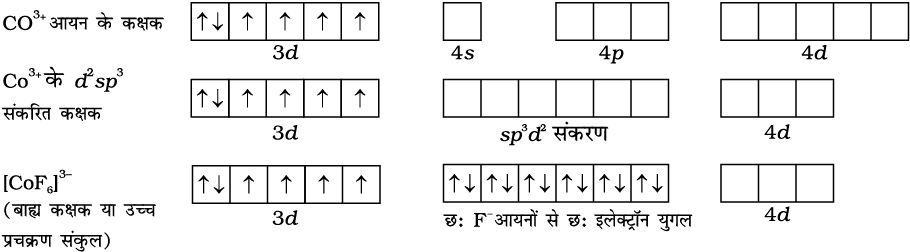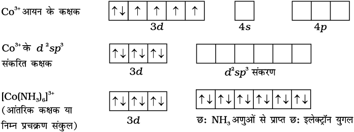 9.8 NH3 की उपस्थिति में, 3d इलेक्ट्रॉन युगलित होते हैं तथा शेष बचे दो रिक्त d-कक्षक d2sp3 संकर में भाग लेकर [Co(NH3)6]3+ के उदाहरण में आंतरिक कक्षक (innerorbital complex) बनाते हैं।