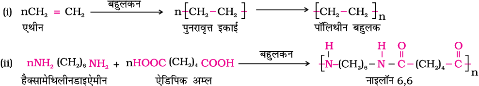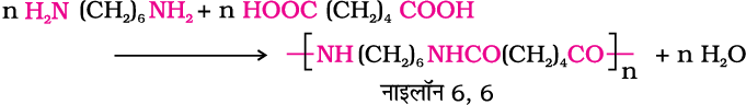(i) नाइलॉन 6,6 - इसका विरचन हैक्सामेथिलीनडाइएेमीन एवं एेडिपिक अम्ल के उच्च दाब और उच्च ताप पर संघनन द्वारा किया जाता है। नाइलॉन 6,6 का उपयोग शीटों, ब्रशों के शूकों (bristles) और वस्त्र उद्योग में किया जाता है।