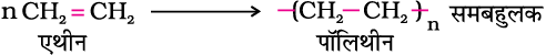 (ii) उच्च घनत्व पॉलिथीन - यह एथीन के किसी हाइड्रोकार्बन विलायक में ट्राईएथिलएलुमिनियम और टाइटेनियम टेट्राक्लोराइड (त्सीग्लर-नट्टा उत्प्रेरक) जैसे उत्प्रेरकों की उपस्थिति में, 333 K से 343 K ताप और 6-7 वायुमंडलीय दाब पर बहुलकन करने से प्राप्त होती है। इस प्रकार निर्मित उच्च घनत्व पॉलिथीन (HDP) में रेखीय अणु होते हैं जैसा नीचे प्रदर्शित किया गया है। इसका घनत्व निविडसंकुलन के कारण उच्च होता है। उच्च धनत्व पॉलिथीन भी रासायनिक रूप से अक्रिय अधिक कठोर और दृढ़ होती है। यह बाल्टियों, कूड़ादानों, बोतलों, पाइपों आदि के निर्माण में प्रयुक्त होती है।