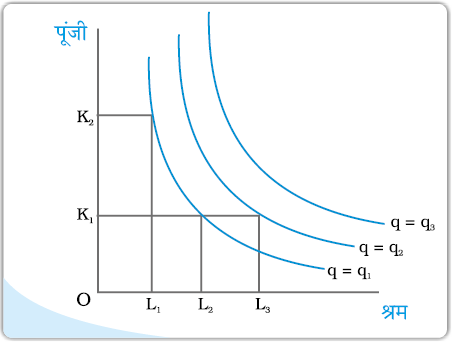 दिया गया चित्र इस संकल्पना का सामान्यीकरण करता है। हम L को X अक्ष पर और K को Y अक्ष पर दिखाते हैं। हमारे पास आगत समतल में तीन निर्गत स्तरों के लिए तीन समान मात्रा हैं– q = q1, q = q2, तथा q = q3। दो आगत संयोग (L1,K2) तथा (L2,K1) हमें निर्गत q1 का समान स्तर देते हैं। यदि हम पूंजी को K1 पर स्थिर करें तथा श्रम को L3 तक बढ़ा दें, तो निर्गत में वृद्धि होती है तथा हम एक और ऊँचे समान मात्रा q = q2 पर पहुँच जाते हैं। जब सीमांत उत्पाद एक आगत की अधिक मात्रा से सकारात्मक होते हैं, समान स्तर के निर्गत का उत्पादन अन्य आगत की कम मात्रा उपयोग में लाकर हो सकती है। अतः समान मात्रा नकारात्मक प्रवणता वाले होते हैं।