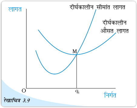 आइए, अब जाँच करते हैं किस प्रकार दीर्घकालीन सीमांत लागत वक्र दिखता है। निर्गत की प्रथम इकाई के लिए दीर्घकालीन सीमांत लागत तथा दीर्घकालीन औसत लागत समान होता है। अब जब निर्गत में वृद्धि हो जाती है, तो दीर्घकालीन औसत लागत में आरंभ में गिरावट आती है और तदुपरांत एक विशेष बिंदु के पश्चात इसमें वृद्धि होने लगती है। जब तक औसत लागत में गिरावट आती है, सीमांत लागत आवश्यक रूप से औसत लागत की तुलना में कम होनी चाहिए। जब औसत लागत में वृद्धि हो रही हो, सीमांत लागत औसत लागत की तुलना में अधिक होगी। अतः दीर्घकालीन औसत लागत वक्र एक 'U' आकार का वक्र है। यह दीर्घकालीन औसत लागत वक्र को नीचे से दीर्घकालीन औसत लागत के न्यूनतम बिंदु पर काटता है। रेखाचित्र 3.9 एक विशिष्ट फर्म के लिए दीर्घकालीन सीमांत लागत तथा दीर्घकालीन औसत वक्र का आकार दर्शाता है।