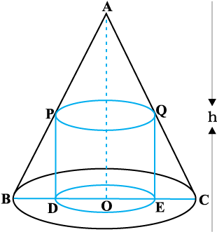 हल मान लीजिए शंकु के आधार की त्रिज्या OC = r और ऊँचाई OA = h है। मान लीजिए कि दिए हुए शंकु के अंतर्गत बेलन के आधार के वृत्त की त्रिज्या OE = x है (आकृति 6.20)। बेलन की ऊँचाई QE के लिए: