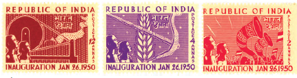 यहाँ प्रदर्शित तीन डाक-टिकटों को प्रथम गणतंत्र दिवस, 26 जनवरी 1950, के अवसर पर जारी किया गया था। इन टिकटों पर छपे चित्र से आपको नए गणतंत्र के सामने खड़ी किन-किन चुनौतियों के बारे में जानकारी मिलती है? अगर आपको 1950 में इन डाक-टिकटों का डिज़ाइन तैयार करने के लिए कहा जाता तो आप इन टिकटों पर किस तरह के चित्र उकेरते?