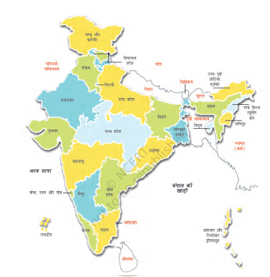नोट: यह नक्शा किसी पैमाने के हिसाब से बनाया गया भारत का मानचित्र नहीं है। इसमें दिखाई गई भारत की अंतर्राष्ट्रीय सीमा रेखा को प्रामाणिक सीमा रेखा न माना जाए।