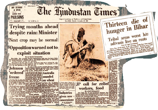 1960 के दशक में कृषि की दशा बद से बदतर होती गई। 1940 और 1950 के दशक में ही खाद्यान्न के उत्पादन की वृद्धि दर, जैसे-तैसे अपने को ऊपर रख पाई थी। 1965 से 1967 के बीच देश के अनेक हिस्सों में सूखा पड़ा। इसी अवधि में भारत ने दो युद्धों का सामना किया और उसे विदेशी मुद्रा के संकट को भी झेलना पड़ा। इसके बारे में हम लोग अगले अध्याय में पढ़ेंगे। इन सारी बातों के कारण खाद्यान्न की भारी कमी हो गई। देश के अनेक भागों में अकाल जैसी स्थिति आन पड़ी। बिहार में खाद्यान्न संकट सबसे ज़्यादा विकराल था। यहाँ स्थिति लगभग अकाल जैसी हो गई थी। बिहार के सभी जिलों में खाद्यान्न का अभाव बड़े पैमाने पर था। इस राज्य के 9 जिलों में अनाज की पैदावार सामान्य स्थिति की तुलना में आधी से भी कम थी। इनमें से पाँच जिले अपनी सामान्य पैदावार की तुलना में महज एक-तिहाई ही अनाज उपजा रहे थे।
