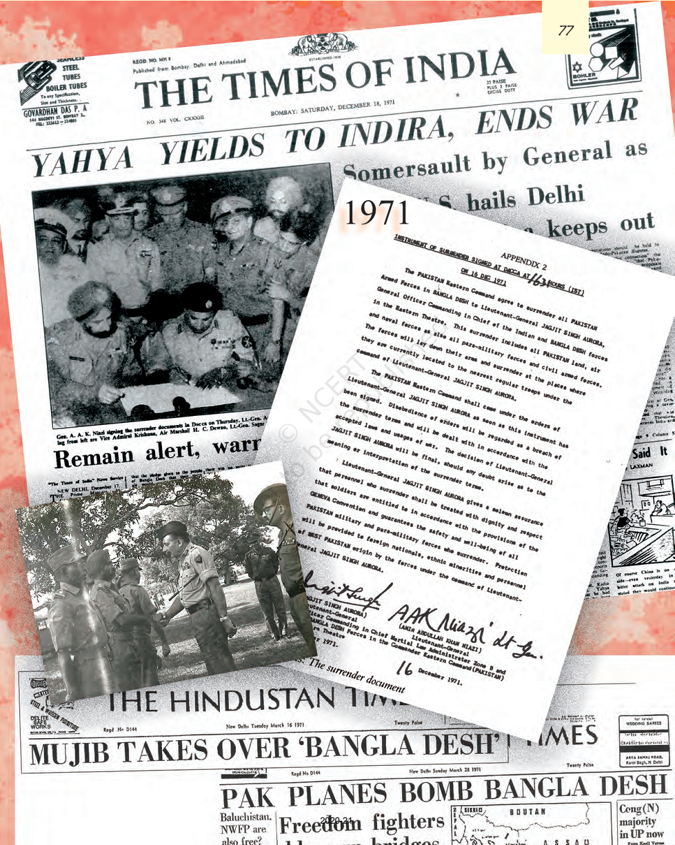 युद्ध में इस निर्णायक जीत से देश में उत्साह की लहर दौड़ गई थी। अधिकांश भारतीयों ने इसे गौरव की घड़ी के रूप में देखा और माना कि भारत का सैन्य-पराक्रम प्रबल हुआ है। आप अगले अध्याय में पढ़ेंगे कि इंदिरा गाँधी इस वक्त भारत की प्रधानमंत्री थीं। 1971 के लोकसभा चुनावों में उन्हें विजय मिली थी। 1971 की जंग के बाद इंदिरा गाँधी की लोकप्रियता को चार चाँद लग गए। इस युद्ध के बाद अधिकतर राज्यों में विधानसभा के चुनाव हुए और अनेक राज्यों में कांग्रेस पार्टी बड़े बहुमत से जीती।