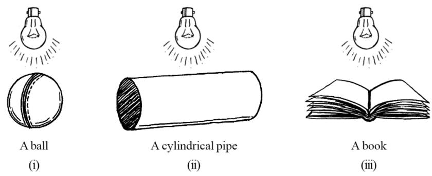 A bulb is kept burning just right above the following solids. Name the shape of the shadows obtained in each case. Attempt to give a rough sketch of the shadow. (You may try to experiment first and then answer these questions).