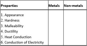 Some properties are listed in the following Table. Distinguish between metals and non-metals on the basis of these properties.