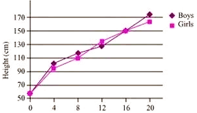 The table below shows the data on likely heights of boys and girls as they grow in age. Draw graphs showing height and age for both boys and girls on the same graph paper. What conclusions can be drawn from these graphs?