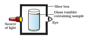 A group of students took an old shoe box and covered it with a black paper from all sides. They fixed a source of light (a torch) at one end of the box by making a hole in it and made another hole on the other side to view the sample taken in a beaker/glass tumbler as shown in the figure. They were amazed to see that milk taken in the glass was illuminated. They tried the same activity by taking a salt solution but found that light simply passed through it