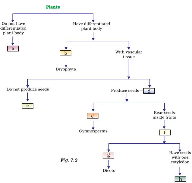 (a) Naked seed (b) Covered seed (c) Flagella (d) Marchantia (e) Marsilea (f) Cladophora (g) Penicillium | (A) Angiosperms (B) Gymnosperms (C) Bryophytes (D) Euglena (E) Thallophyta (F) Pteridophyta (G) Fungi |
